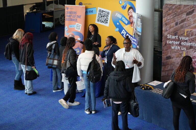 Companies all have a clothed trellis table and space to display pop-up banners and promotional materials. They meet women who are studying a STEM course at university and looking for graduate careers and internships.